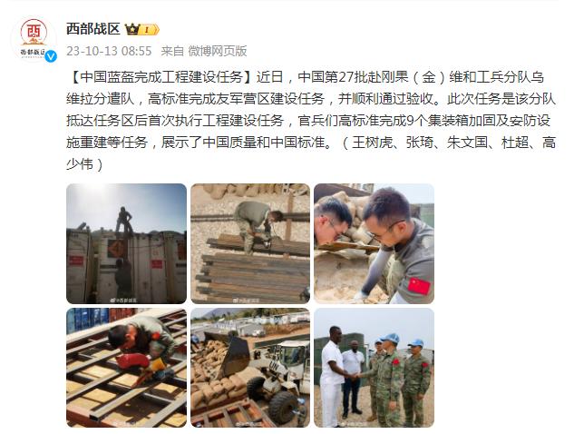 近日,中國第27批赴剛果(金)維和工兵分隊烏維拉分遣隊,高標準完成友軍營區建設任務,並順利通過驗收。此次任務是該分隊抵達任務區後首次執行工程建設任務,官兵們高標準完成9個集裝箱加固及安防設施重建等任務,展示了中國質量和中國標準。(王樹虎、張琦、朱文國、杜超、高少偉)