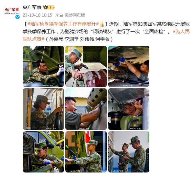 近期,陸軍第83集團軍某旅組織開展秋季換季保養工作,爲馳騁沙場的“鋼鐵戰友”進行了一次“全面體檢”。(孫嘉晨 李淵堂 劉偉偉 何宇弘)