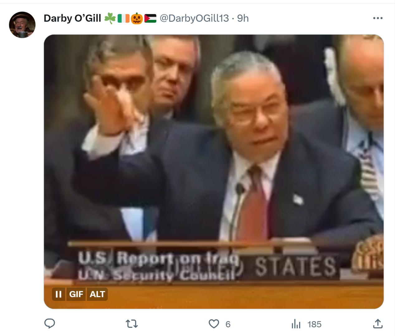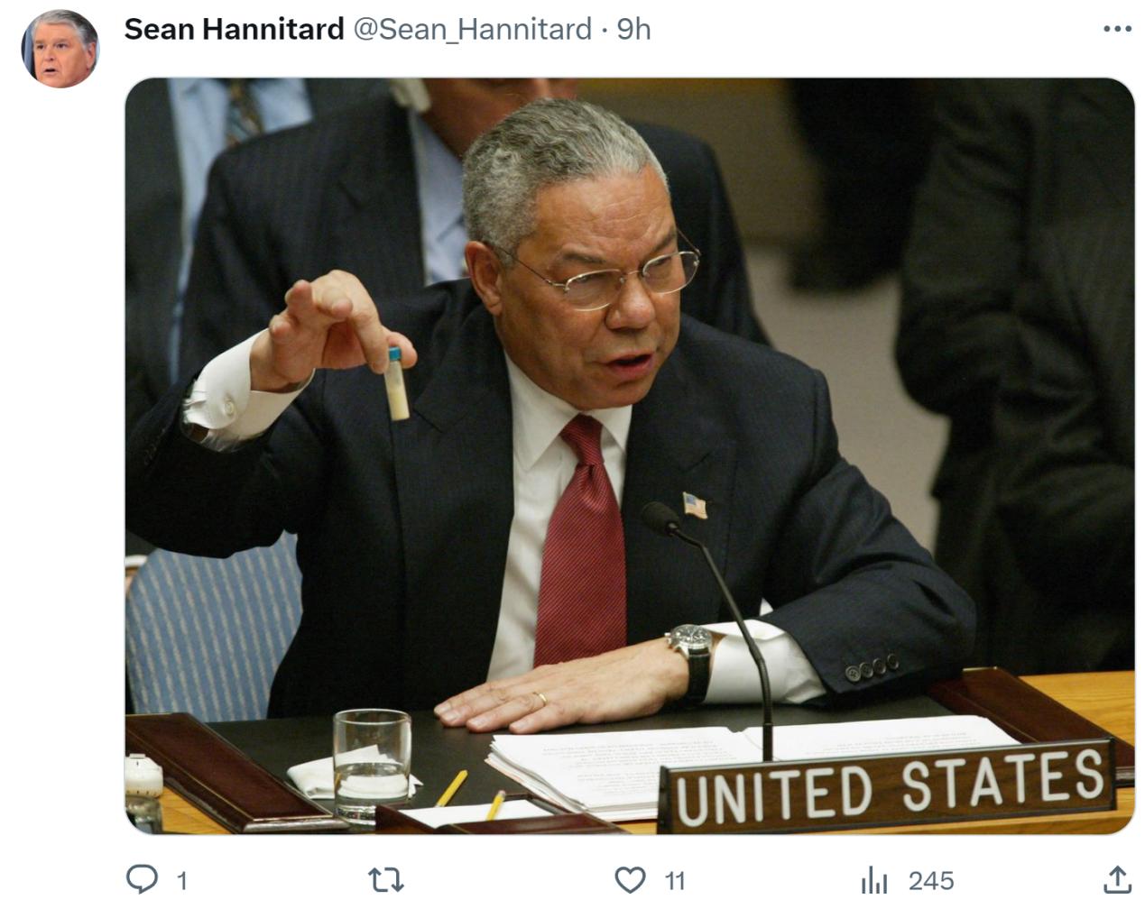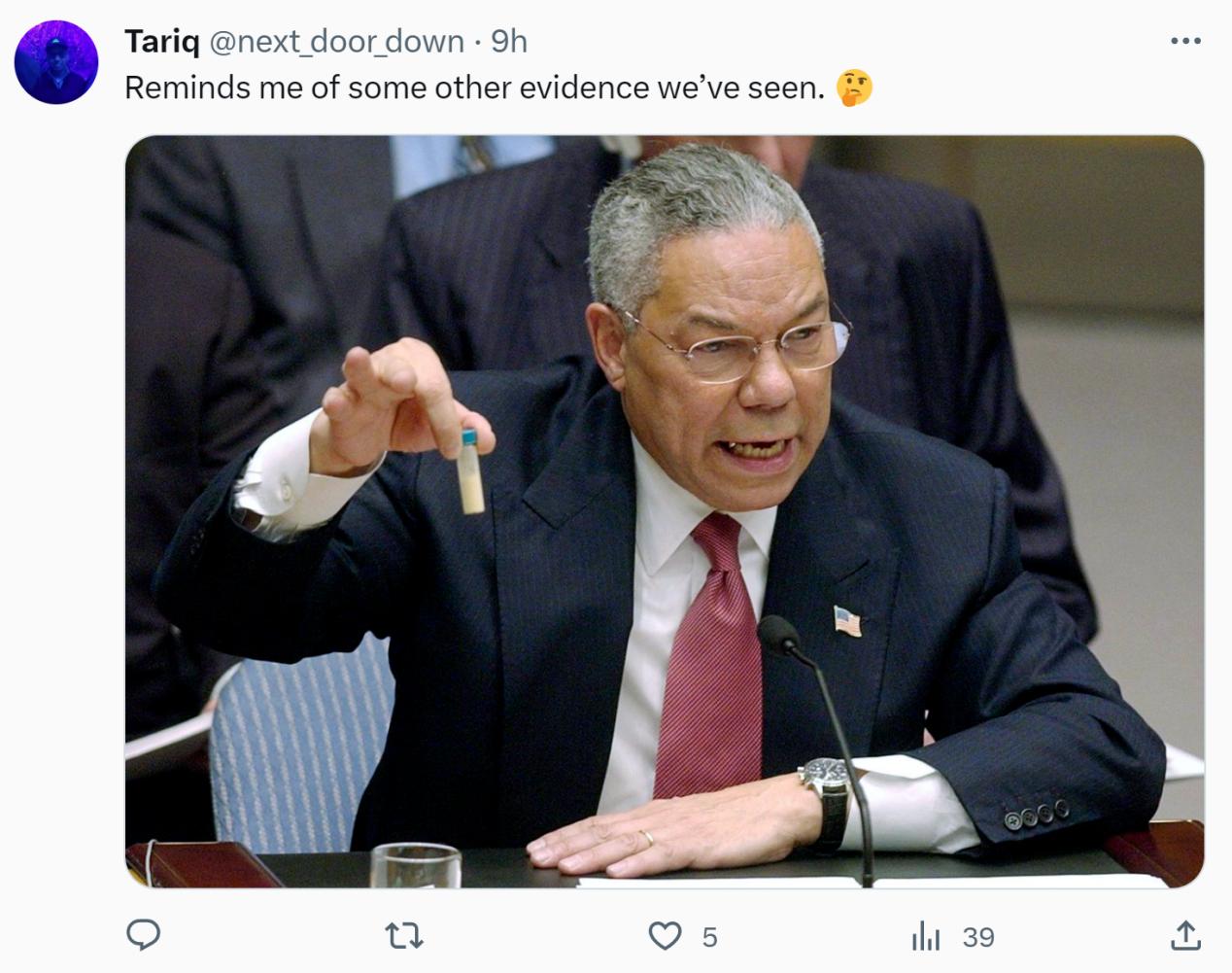 美國《紐約郵報》也轉載了這一消息,但在《紐約郵報》發佈於社交平臺X的這則消息下方,有網友直接曬出2003年時任美國國務卿鮑威爾手拿洗衣粉指控伊拉克擁有“大規模殺傷性武器”的舊照↓