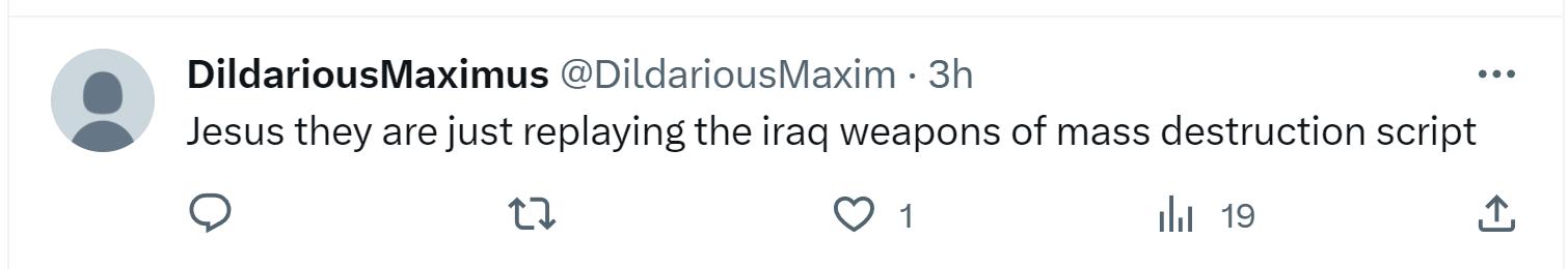 還有網友表示,“天啊,他們只是在重演‘伊拉克擁有大規模殺傷性武器’的劇本。”↓