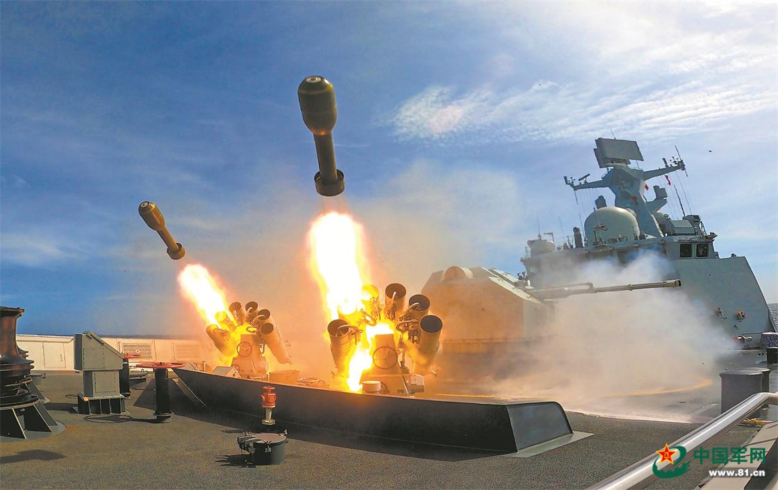時間一分一秒過去。突然,聲吶兵發現目標。指揮員果斷下達打擊命令,數枚火箭深彈呼嘯出膛,目標海域頃刻間騰起道道水柱……