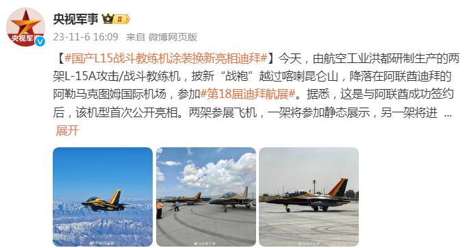 今天,由航空工業洪都研製生產的兩架L-15A攻擊/戰鬥教練機,披新“戰袍”越過喀喇崑崙山,降落在阿聯酋迪拜的阿勒馬克圖姆國際機場,參加第18屆迪拜航展。據悉,這是與阿聯酋成功簽約後,該機型首次公開亮相。兩架參展飛機,一架將參加靜態展示,另一架將進行飛行特技表演。(總檯記者李超)