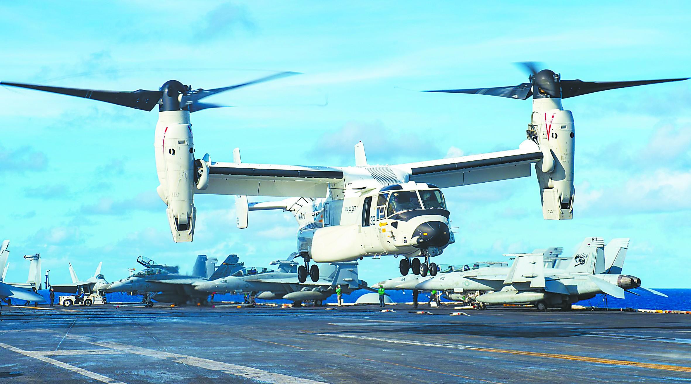 據介紹,CMV-22同樣是基於MV-22的改進型,它的螺旋槳槳葉和機翼都可以摺疊以節省寶貴的艦上空間。相比老態龍鍾的C-2A,CMV-22的航程更遠,具備夜間在航母上的起降能力。更重要的是,它不需要彈射器就能從航母上起飛,還能在驅逐艦的飛行甲板上降落,能方便地在美海軍艦艇之間運送人員和物資。時任美國太平洋艦隊海軍航空兵司令肯尼斯·懷特塞爾中將2022年曾稱讚CMV-22在快速着艦、起飛、裝載和卸載方面具有靈活性。但美國彭博社2022年引用五角大樓測試辦公室的一份非公開文件稱,CMV-22的防冰系統故障不斷,將導致任務失敗。同時該機的高頻無線電設備也存在問題。但總體而言,CMV-22裝備數量有限,這次停飛不會對美海軍艦隊正常運作造成太大影響,當前僅有“卡爾·文森”號航母搭載有CMV-22提供後勤保障飛行服務。