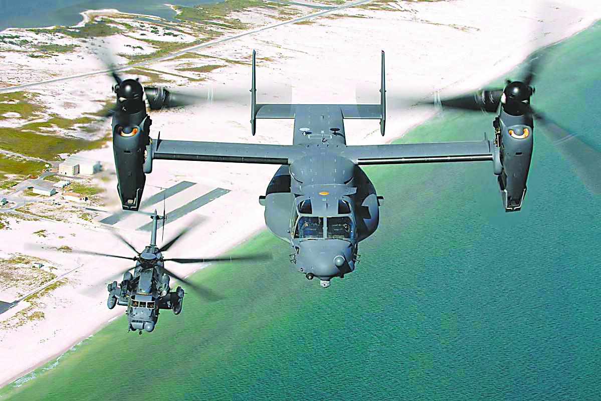 與美國海軍陸戰隊相比,雖然美國空軍是11月這次墜機事故的“苦主”,但被“魚鷹”停飛拖累的情況相對好一些,影響範圍主要集中在特種作戰方面。美國空軍特種作戰司令部也看上了“魚鷹”的快速與遠航程特性,採購CV-22以取代MH-53J特種作戰直升機。CV-22與MV-22有85%的部件相同,主要是增加了特種作戰的相關設備,例如配備的多模式雷達具有地形跟隨/地形規避模式,以滿足超低空貼地飛行執行隱祕任務的需要。該機還裝有集成雷達頻率對抗措施裝置和定向紅外對抗措施系統,並具有外掛油箱能力以進一步提升航程。美國空軍曾宣稱:“CV-22的速度和航程是直升機的兩倍,能從小場地起降,這些特性使它能增強特種作戰部隊的任務能力。CV-22裝有多模式雷達系統,使之能在不利氣象條件下和夜間飛行。能在任何地方、任何時間完成任務對特種作戰部隊來說特別重要。CV-22就是這樣一種關鍵裝備。尤其是更大的航程可降低飛機和機組在兩次任務間的風險,更大的速度能降低機組和乘員的工作負荷和疲勞,全電子式儀表則簡化了飛行工程師的工作。”