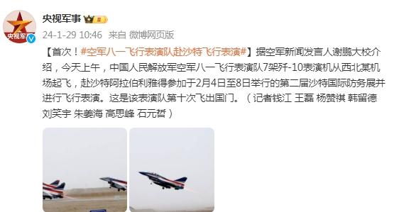 據空軍新聞發言人謝鵬大校介紹,今天上午,中國人民解放軍空軍八一飛行表演隊7架殲-10表演機從西北某機場起飛,赴沙特阿拉伯利雅得參加於2月4日至8日舉行的第二屆沙特國際防務展並進行飛行表演。這是該表演隊第十次飛出國門。(記者錢江 王磊 楊贊祺 韓留德 劉笑宇 朱姜海 高思峯 石元哲)