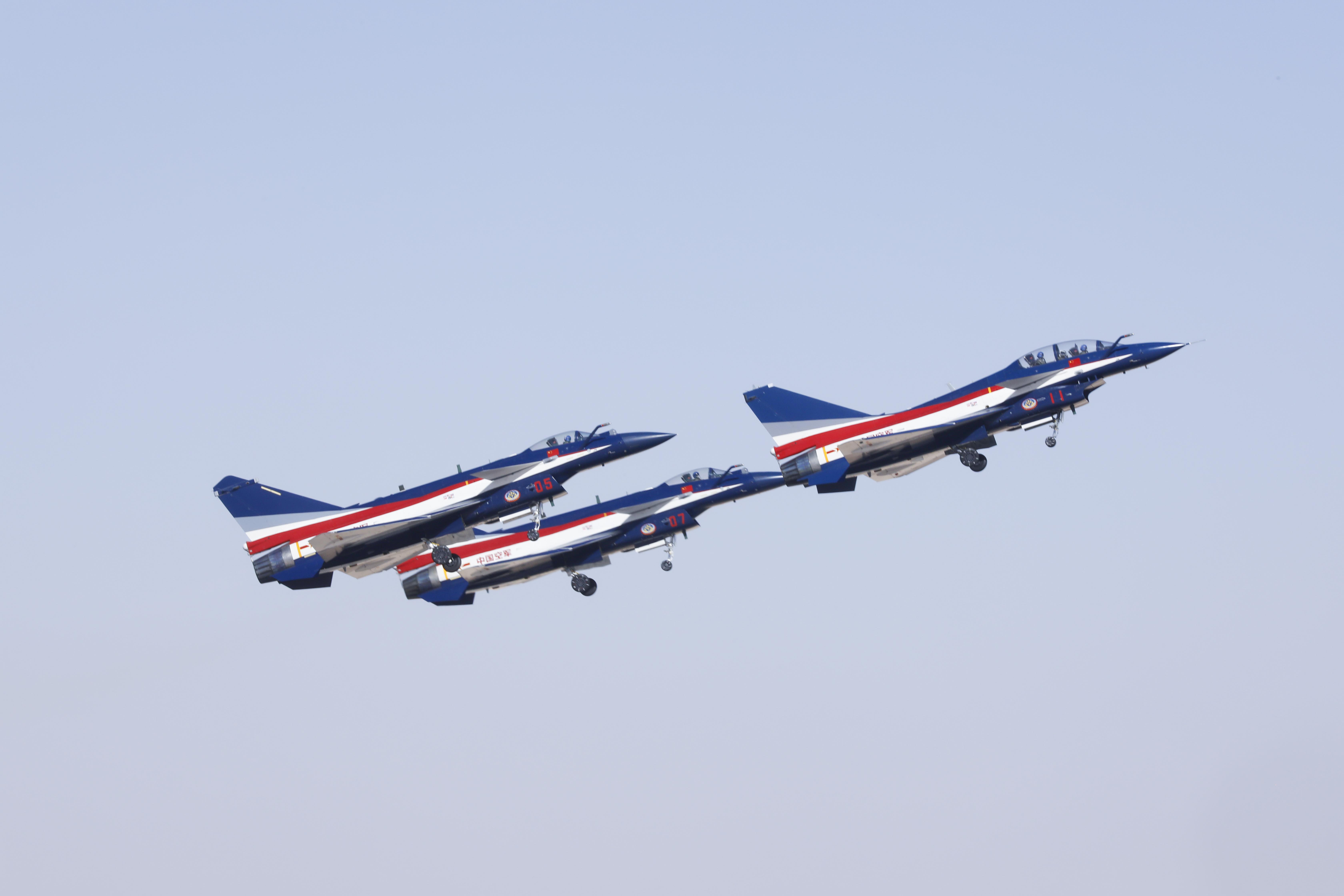 當地時間13時30分許,3架殲-10表演機打開滑行燈,以箭隊加力起飛,緊接着第二批三機加力跟進起飛,在空中完成集結編組。