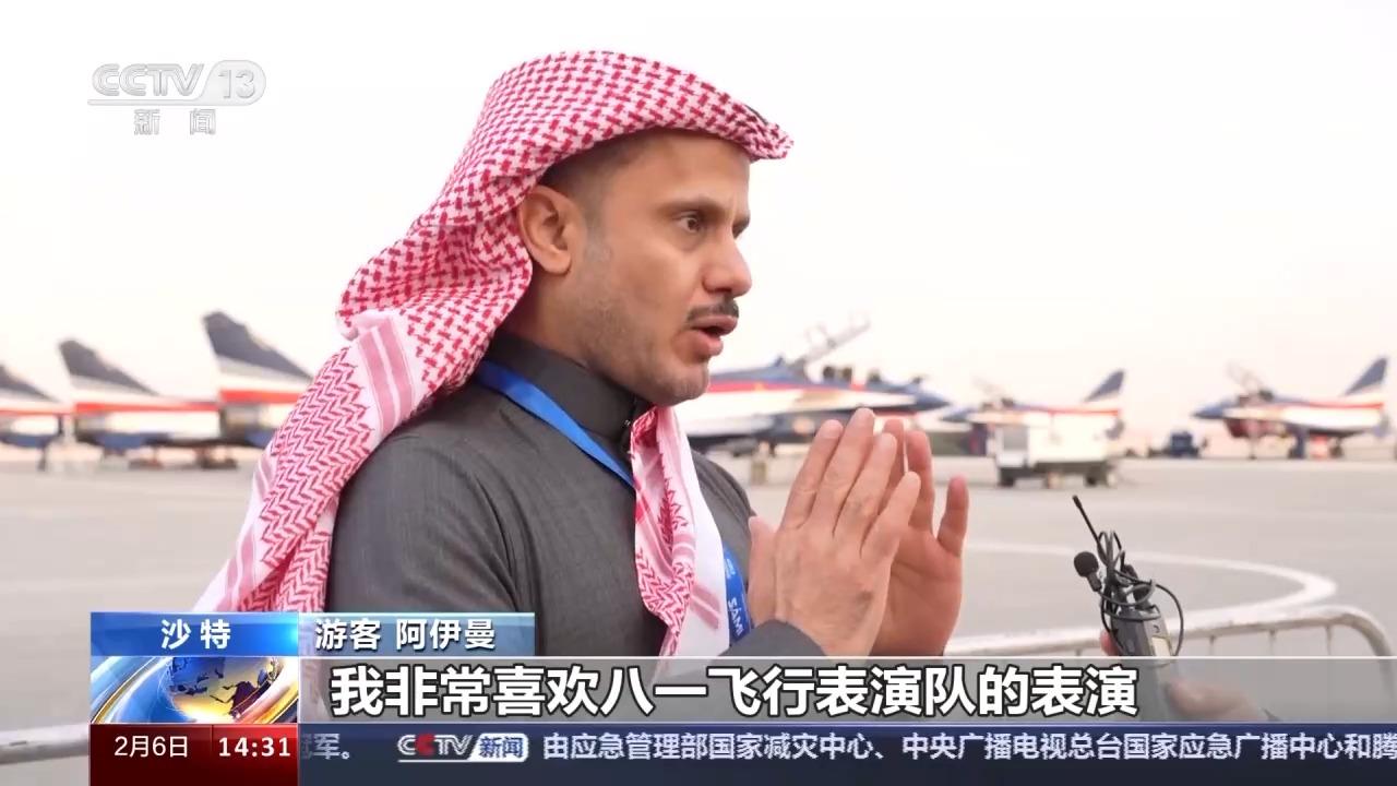 遊客 阿伊曼:我非常喜歡八一飛行表演隊的表演,尤其是空中開花的動作,我期待他們明天還能再次表演。我非常喜歡中國,歡迎中國空軍來沙特,謝謝他們帶來的這場表演。