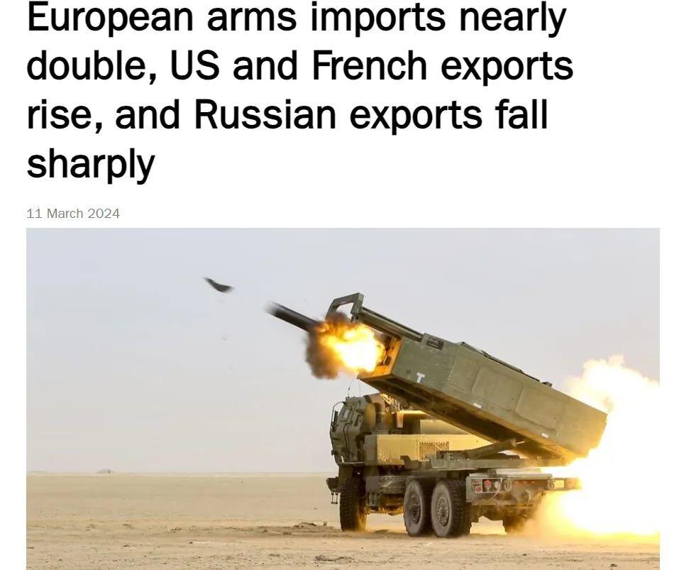 瑞典斯德哥爾摩國際和平研究所表示,俄烏衝突推進歐洲國家大規模採購新武器,而美國武器製造商成爲最大受益者。從2019到2023年,全球武器貿易總體上比2014-2018年下降了3.3%,但同期歐洲國家進口的武器數量比前五年翻了一番。在對歐洲國家的武器銷售中,美國佔了55%的市場,這比前一個時期上升了20個百分點。