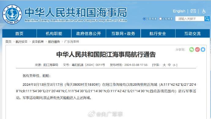陽江海事局發佈航行警告,3月13日至3月17日,每天8時至18時30分,在陽江市海陵島以南20海里附近海域進行軍事活動,禁止駛入。