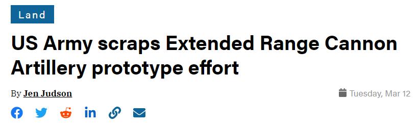 報道稱,美國陸軍採購負責人道格·布什表示,美國陸軍正在改變其獲取遠程火炮能力的方式,並取消了新型58倍口徑“增程火炮(ERCA)”的原型設計工作。他告訴記者:“我們去年秋天完成了原型設計活動。不幸的是,它不夠成功,無法直接投入生產。”
