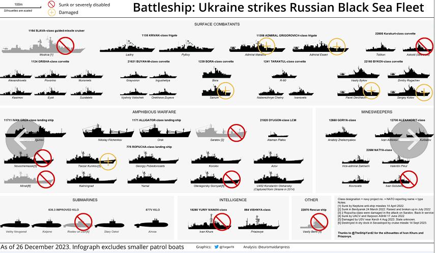 從戰果而言,更值得烏克蘭方面慶賀。在俄烏衝突爆發以前,俄軍曾在黑海地帶集結了13艘登陸艦準備執行兩棲作戰。但此後在烏克蘭自殺式無人艇、無人機和巡航導彈的反覆攻擊下,俄黑海艦隊損失慘重。據烏克蘭方面的戰報,在24日的成功突襲之後,俄軍僅有3艘登陸艦能夠使用。此外,俄黑海艦隊還損失了旗艦“莫斯科”號導彈巡洋艦、兩艘護衛艦、1艘補給艦、1艘潛艇和多艘巡邏艇。