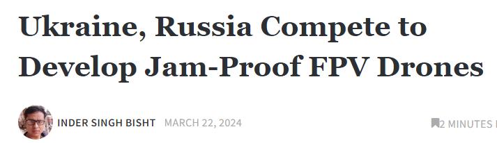 《防務郵報》網站題爲“烏克蘭和俄羅斯競相開發防干擾FPV無人機”的報道稱,俄烏的無人機開發商正在競相開發不受無線電干擾影響的FPV攻擊無人機。烏方公開了烏克蘭武裝部隊第60和第63機械化旅開發的一架此類無人機的視頻。視頻中,無人機鎖定並命中了俄坦克。據稱,這次打擊是在“電子戰系統積極壓制的條件下進行的”。