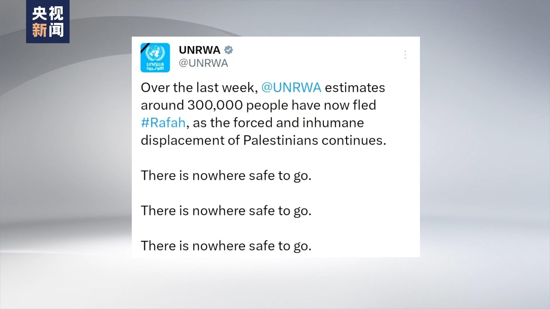 聯合國近東巴勒斯坦難民救濟和工程處12日在社交媒體表示,過去一週,估計已有大約30萬人從拉法逃離。聯合國近東救濟工程處強調,這些流離失所者“沒有安全的地方可以去”。