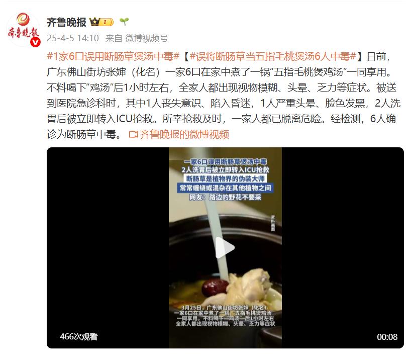 日前,廣東佛山街坊張嬸(化名)一家6口在家中煮了一鍋“五指毛桃煲雞湯”一同享用。不料喝下“雞湯”後1小時左右,全家人都出現視物模糊、頭暈、乏力等症狀。被送到醫院急診科時,其中1人喪失意識、陷入昏迷,1人嚴重頭暈、臉色發黑,2人洗胃後被立即轉入ICU搶救。所幸搶救及時,一家人都已脫離危險。經檢測,6人確診爲斷腸草中毒。