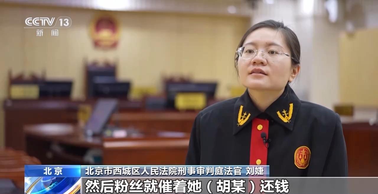 北京市西城區人民法院刑事審判庭法官 劉婕:見面會這些承諾都沒有實現,粉絲就催着胡某還錢,她一直沒有還錢,還以她父親生病去世這些理由去拖延,粉絲感覺到不對勁就報案了。