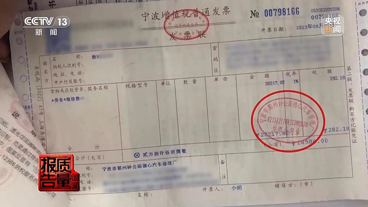 除了頻繁拖車,張女士還發現,事故車的維修發票居然是行車記錄儀中從沒出現過的另一個修理廠開具的。這意味着,她的車子在維修過程中至少涉及三家修理廠。