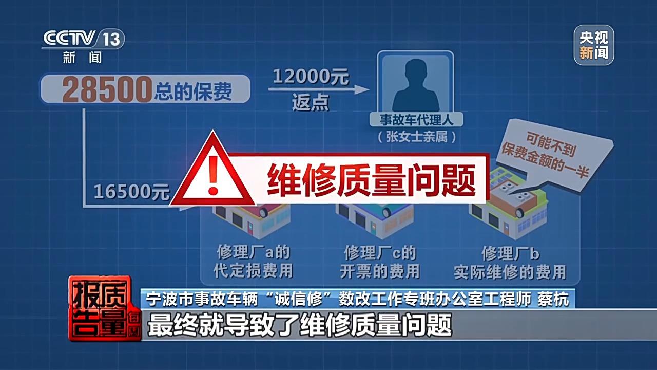寧波市事故車輛“誠信修”數改工作專班辦公室負責人 洪磊:實際上我們也有遇到過蠻多的案子,拿到理賠費用之後進行多方瓜分,真正用於事故車輛維修的可能已經不到一半了,甚至只有三成四成。可想而知這個車的質量肯定是有問題的。