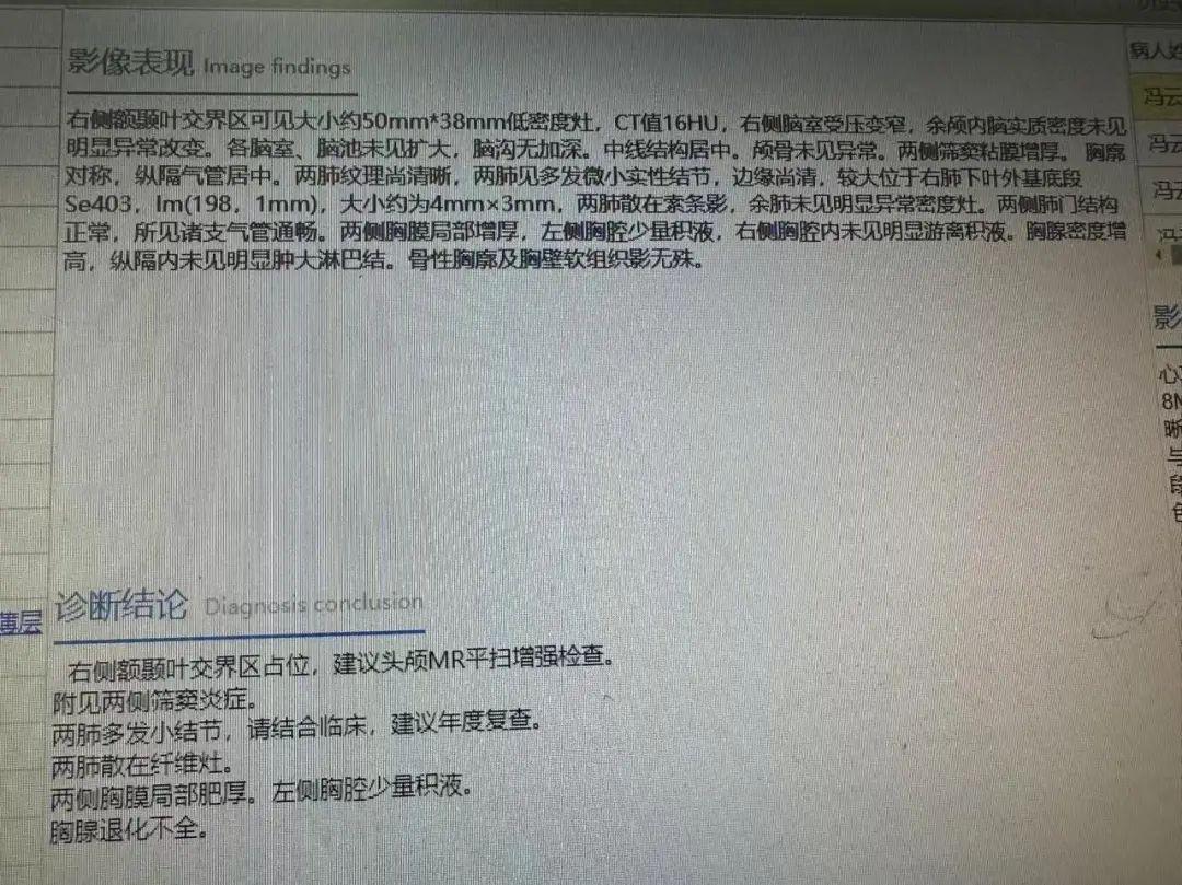 不查不知道,一查嚇一跳,CT結果顯示:右側額顳葉交界區可見大小50mm*38mm低密度竈,右側腦室受壓變窄。發現情況不對的陳田芳急忙催促李女士去上級醫院腦外科做進一步檢查,而據上級醫院的MRI核磁結果表明,考慮爲IDH突變型瀰漫性星形細胞瘤。