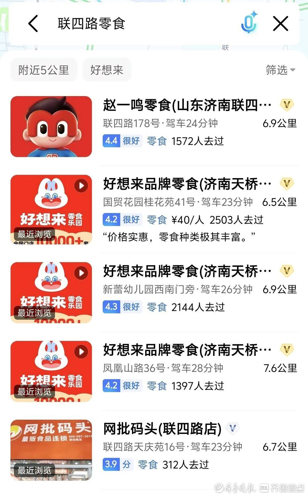“濟南聯四路不到800米開了4家零食店鋪,兩家好想來、一家網批碼頭,還有一家趙一鳴。”市民張女士說。