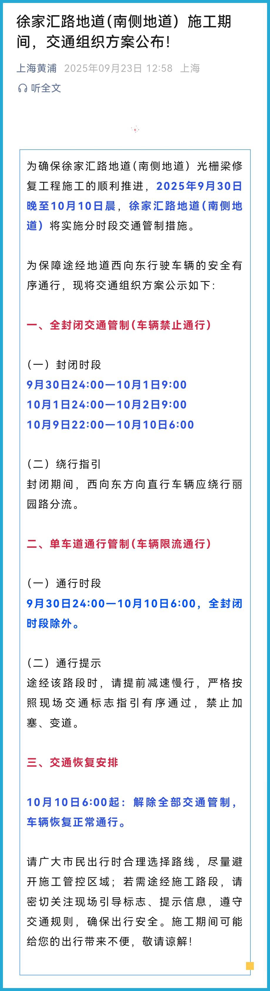 昨天中午,據上海市黃浦區官方公衆賬號“上海黃浦”消息:爲確保徐家彙路地道(南側地道)光柵梁修復工程施工的順利推進,2025年9月30日晚至10月10日晨,徐家彙路地道(南側地道)將實施分時段交通管制措施。