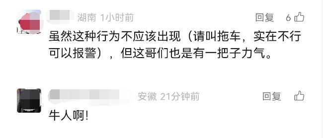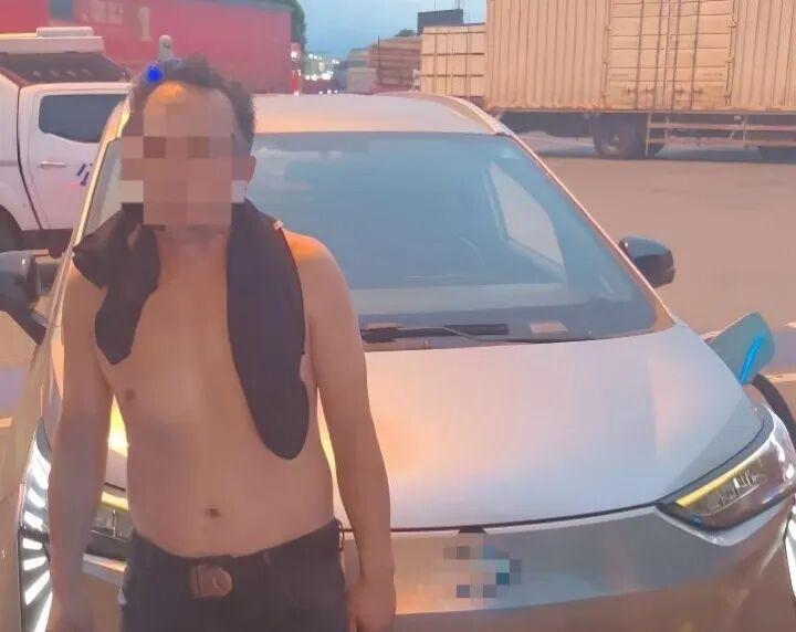 此時的劉某,光着膀子,滿頭大汗,他說自己開的是一輛新能源汽車,結果電量不足,他只好下車推行。