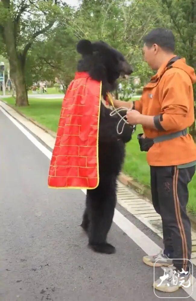 社交平臺發佈的視頻中,一隻身披紅色袈裟的黑熊直立着在硬化的路上走了幾步,一男子牽着黑熊脖子上套着的一根繩子,還不時摸摸黑熊。視頻裏有人說,“搞得像個人樣的。”
