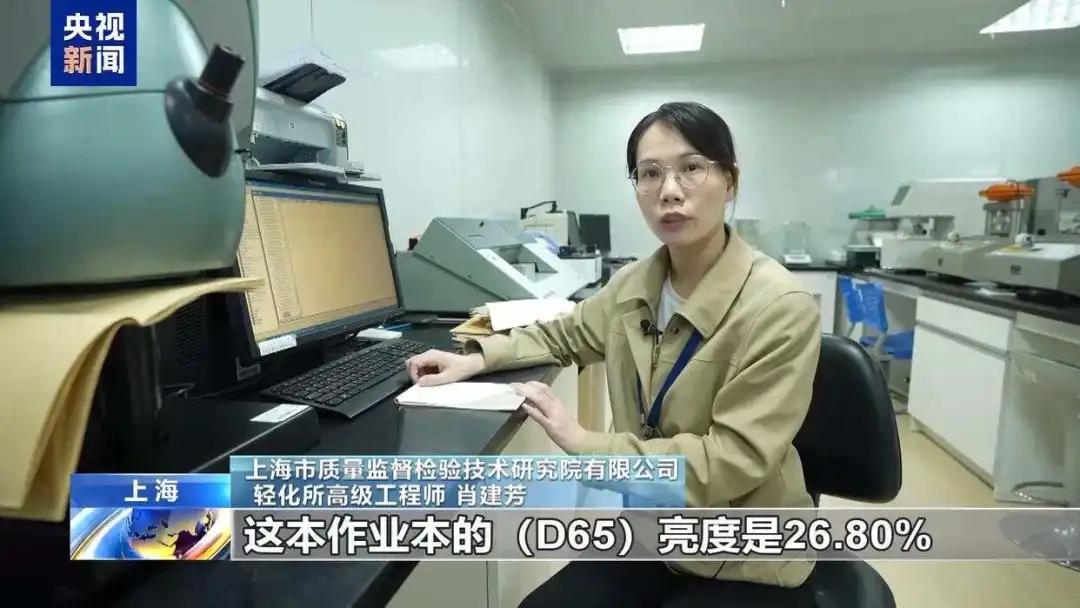 上海市質量監督檢驗技術研究院有限公司輕化所高級工程師 肖建芳:測試下來這本作業本的D65亮度是26.80%,而國家標準規定的是亮度下限值是55.0%,遠遠低於國家標準的下限要求,也是不合格的。
