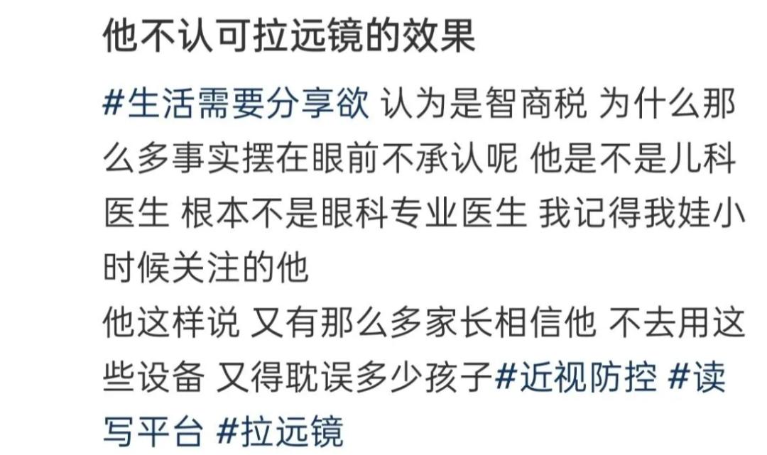 支持者認爲,拉遠鏡“原理可行”“反饋好”“有點證據哦”,反對者則表示不能直接證明可預防近視,過度依賴拉遠鏡反而忽略了戶外活動等。
