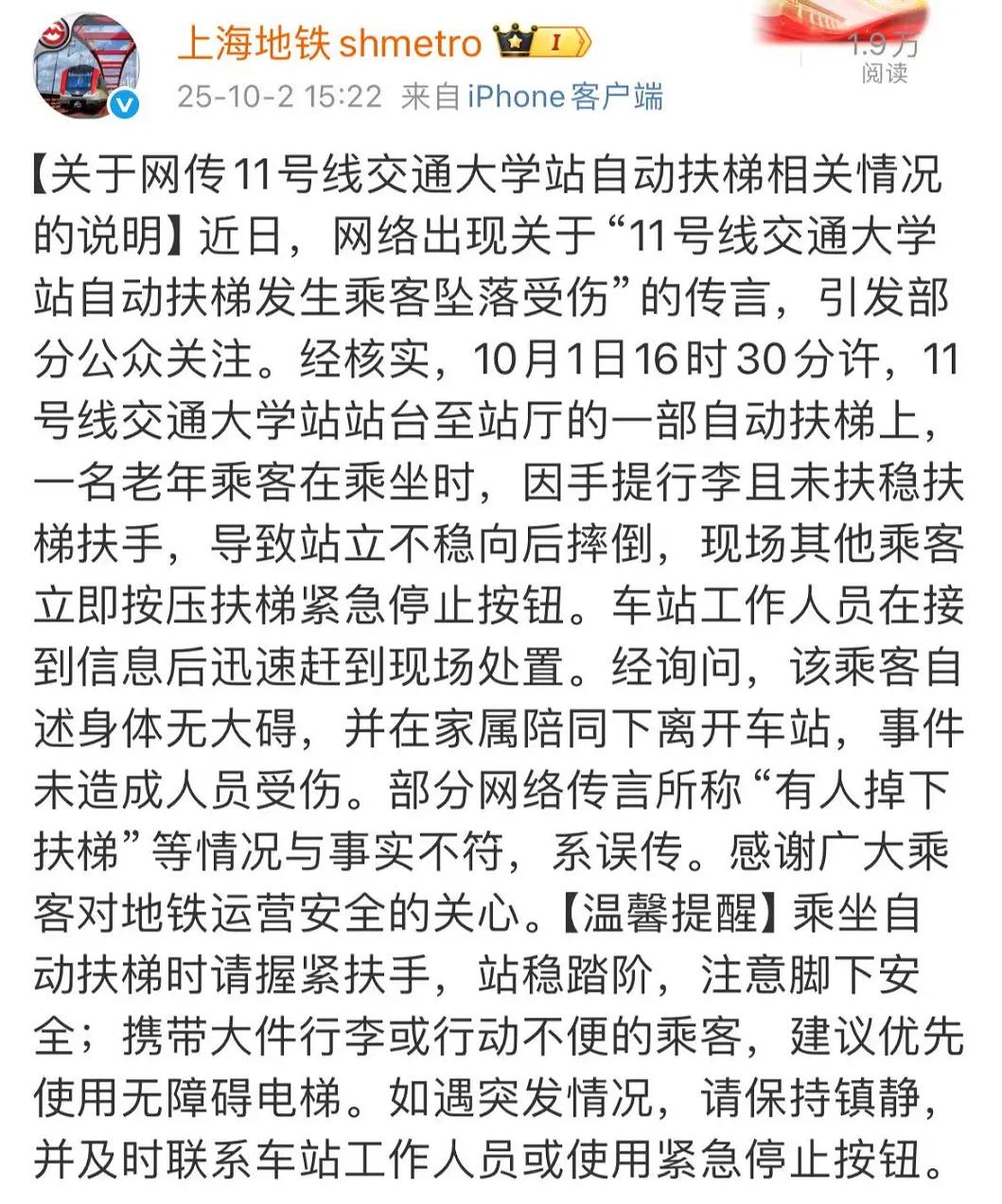 經覈實,10月1日16時30分許,11號線交通大學站站臺至站廳的一部自動扶梯上,一名老年乘客在乘坐時,因手提行李且未扶穩扶梯扶手,導致站立不穩向後摔倒,現場其他乘客立即按壓扶梯緊急停止按鈕。車站工作人員在接到信息後迅速趕到現場處置。