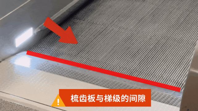 自動扶梯梳齒板與梯級、圍裙板與梯級、梯級與梯級的間隙,容易卷吸衣服裙襬或材質柔軟的鞋子,請勿在這些區域站立或停留。