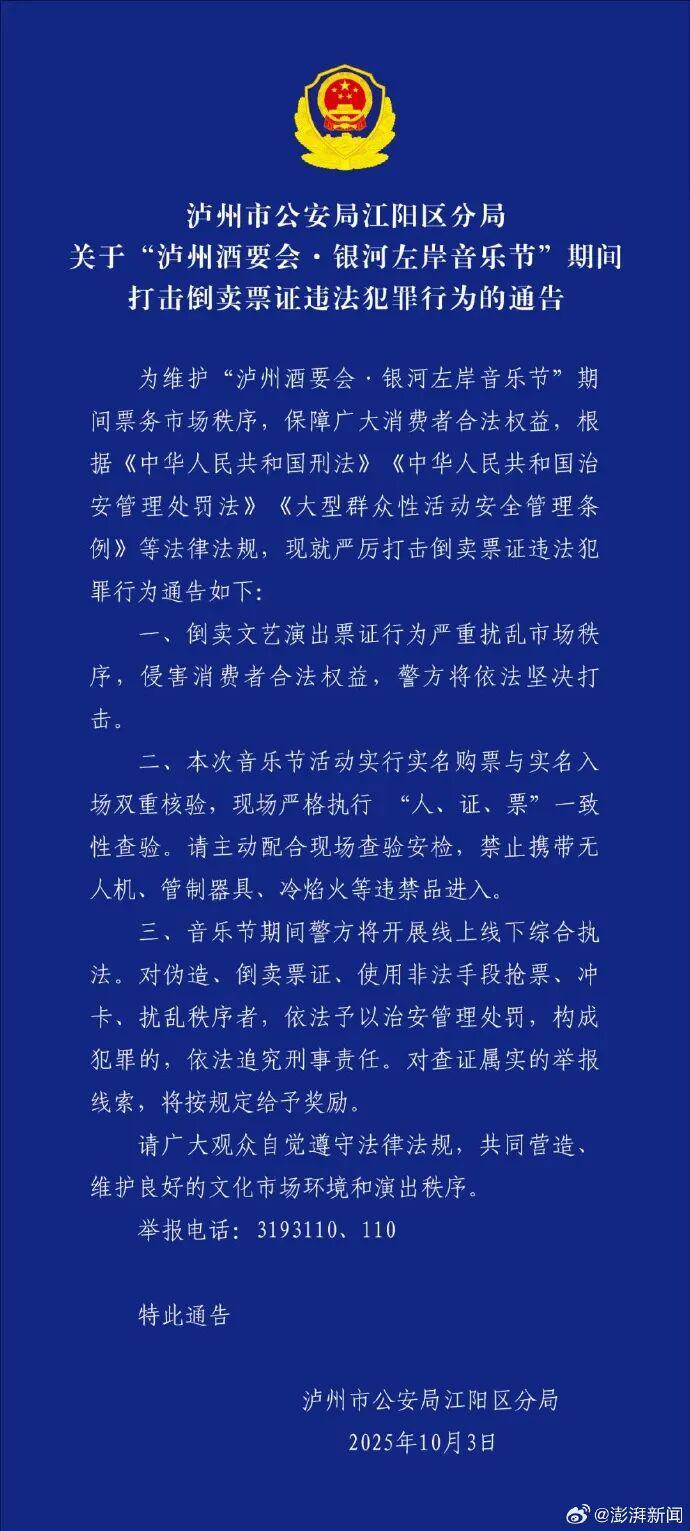 瀘州市公安局江陽區分局10月3日上午發佈《關於“瀘州酒要會·銀河左岸音樂節”期間打擊倒賣票證違法犯罪行爲的通告》(以下簡稱:《通告》)稱,音樂節期間警方將開展線上線下綜合執法。