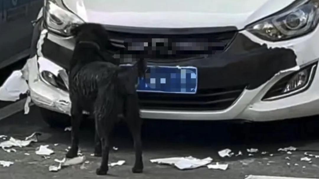 掛斷電話後,馬女士第一反應是遭遇詐騙,但出於謹慎還是趕往停車場查看。抵達車位時,眼前的場景讓她又驚又氣——自己的白色私家車前方車衣被撕得粉碎,散落一地,車身佈滿口水與牙齒印,一旁還站着一隻戴着項圈的黑狗。