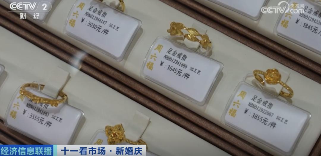 廣東深圳某黃金珠寶品牌門店店長 張妮蔓:國慶期間,新品搭配好的婚慶4件套(一口價產品),相對來說比較受結婚的人喜愛,價格是一萬多元,性價比較高。