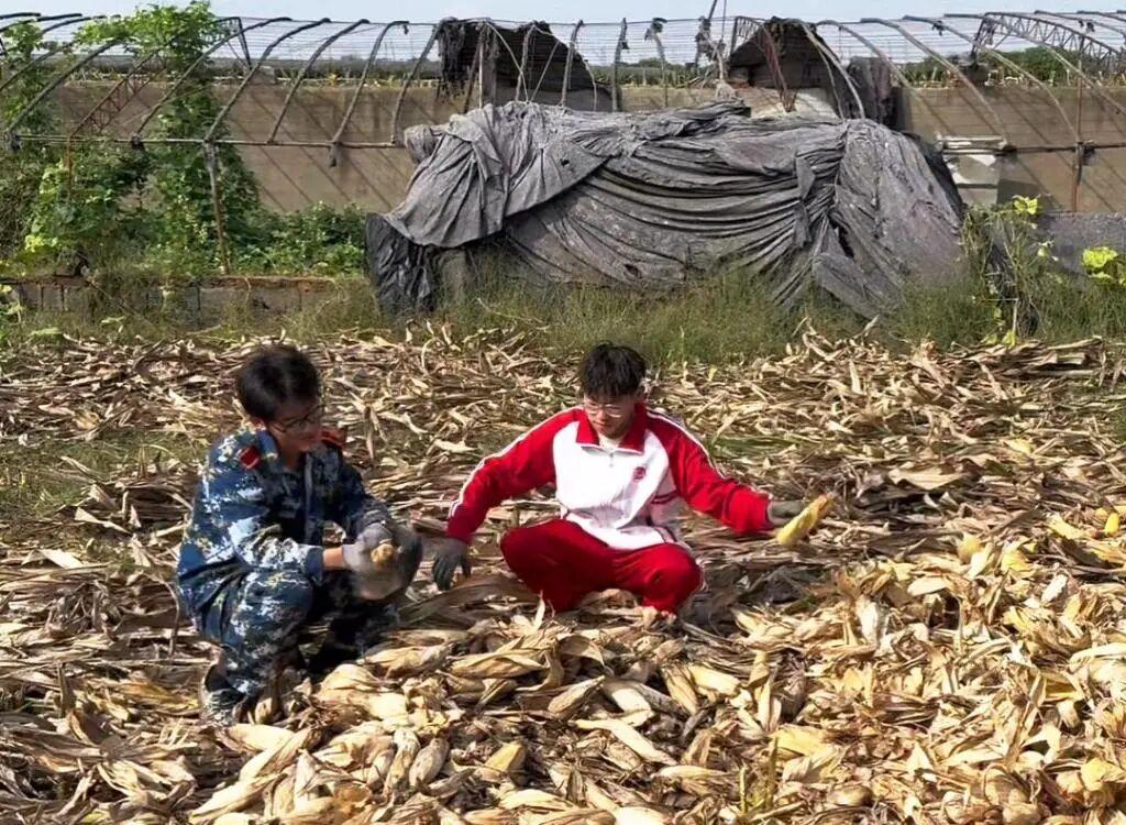 國慶中秋假期,孟成(左)穿着新生軍訓時發的迷彩服和陳浩宇在地裏掰玉米。