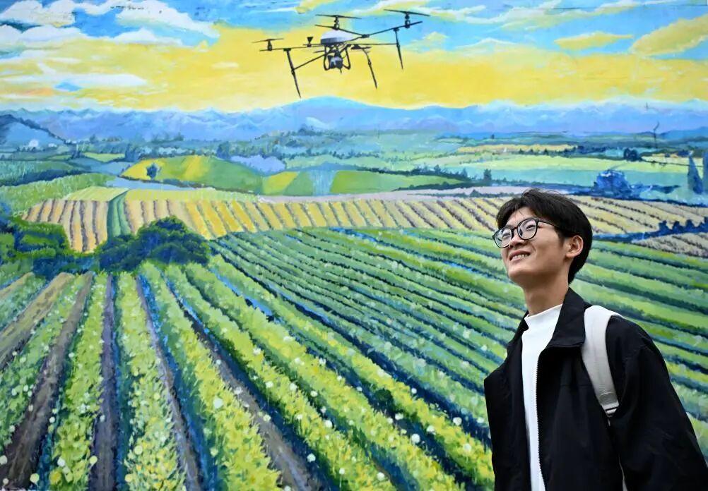 10月11日,孟成從青島農業大學校園內一處大型鄉村振興主題牆繪前經過。