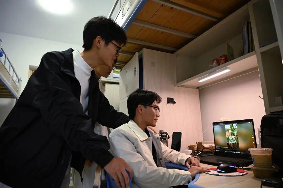10月11日,孟成(左)在學校寢室向室友介紹自己之前發佈的在地裏幹活的視頻。