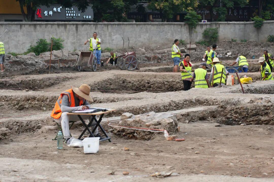 “本次出土發現了五個比較大的磉墩,推測這裏曾經有一處面闊五間、進深三間的建築。因爲體量比較大,不像老百姓的房子,應是公共建築。結合晚清的《寧郡地輿圖》和《鄞縣通志》裏的《鄞縣城廂圖》,有可能是當時的‘萬壽寺’。”