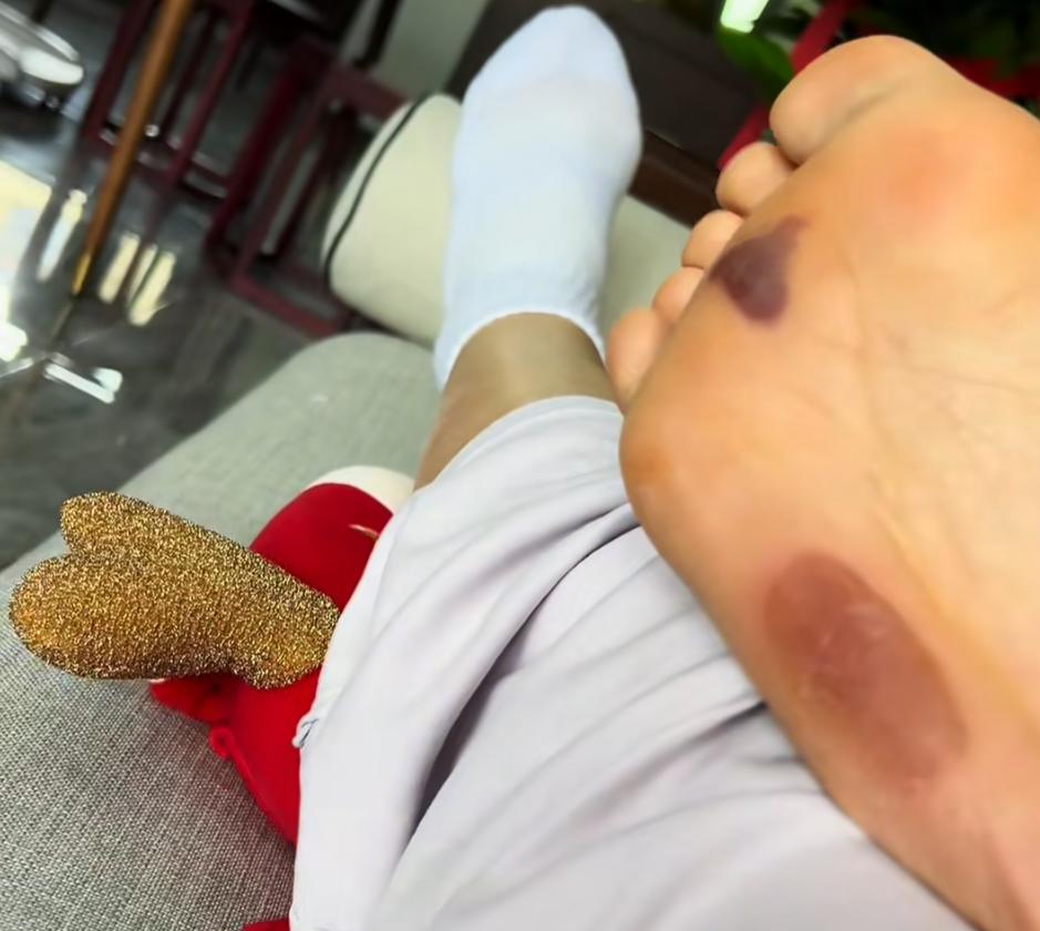 薛女士稱剛開始10多分鐘時感覺蠻有效果,到了15分鐘的時候疼痛加劇,但自己以爲痛則不通,忍痛踩到20分鐘時腳底板突然噴血,發現有大面積血泡且有的已被磨破。