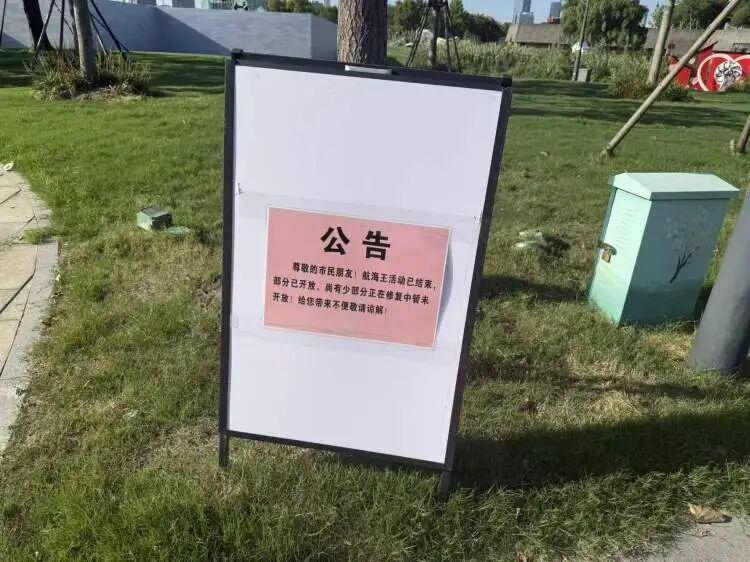 場地裏多個地方已經立起了“航海王活動已結束,部分已開放,尚有少部分正在修復中暫未開放!”的公告。綠地上KT板、遊戲道具等物品仍散落擺放着,使得原本生機勃勃的草地一度呈現出“遊樂園廢墟”的景象。