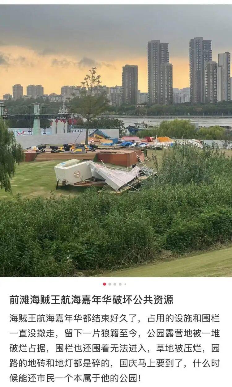 位於浦東江畔、擁有整片開闊草坪的鰻鱺嘴濱江綠地,一直被市民和遊客稱作“寶藏露營地”。近日,多名市民反映,今年8月底落幕的“航海王嘉年華”遲遲未拆,原本的露營草地淪爲“樂園廢墟”。