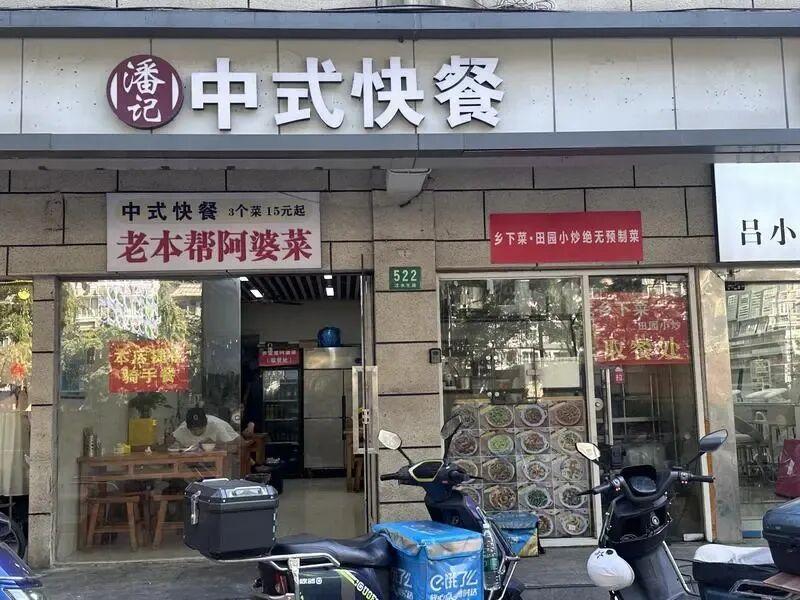 根據平臺上展示的商家地址,記者找到了位於汶水東路的這家店鋪,發現該店僅爲沿街商鋪的一間門面,門口緊鄰人行道,停滿非機動車之後,僅剩狹窄通道供行人通行,根本就沒有外擺位,門面內就是一個廚房,所謂的堂食實際上是另外一家店鋪“老本幫阿婆菜”的空間。而這兩家店鋪在平臺上均有上架,共用廚房共享空間。