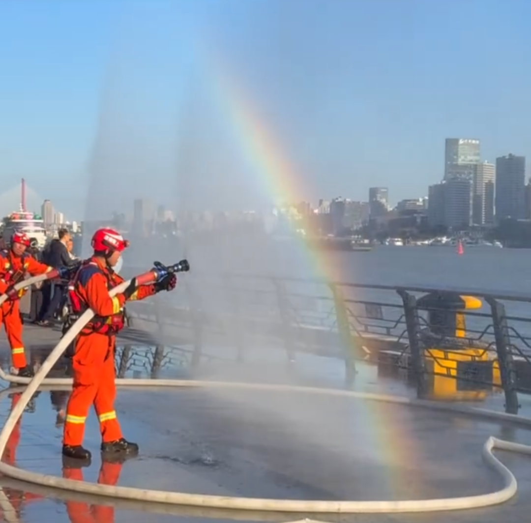 活動中,消防員們用水槍噴出了一道道彩虹,遊客們紛紛拿手機記錄“人造彩虹”和東方明珠等上海地標建築同框的畫面。
