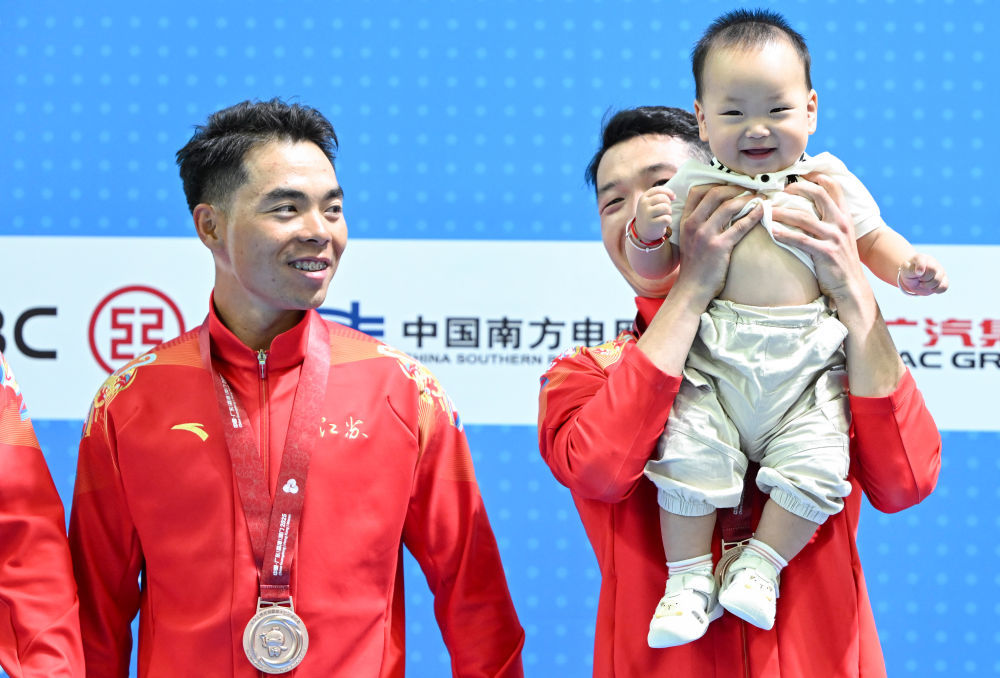 領獎臺上,帶傷出戰的江蘇老將郭亮舉起了自己九個月大的兒子,贏得現場一片掌聲和祝福。