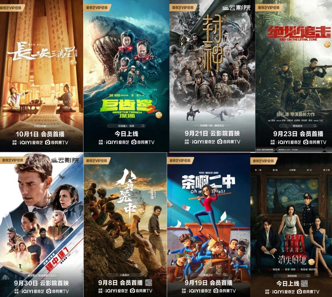 據介紹,在10月4日的電影熱度榜TOP10中,8部爲暑期檔院線佳作。國慶節上線的《長安三萬裏》成爲平臺熱度最高電影,《巨齒鯊2:深淵》與節前上線的《封神第一部:朝歌風雲》分列第二三位,《絕地追擊》《碟中諜7:致命清算(上)》《八角籠中》《茶啊二中》《消失的她》進入熱度TOP10。假期大屏端播放時長TOP10中,也有7部暑期檔作品。根據愛奇藝數據研究中心提供數據,假期愛奇藝電影頻道日均播放時長較節前環比增長了28%。
