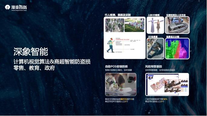 他例舉了AI技術在銀泰百貨商業決策系統、商超的智慧防損、智慧客流的實際應用,以及深象智能技術在不同垂直領域發揮的作用:“譬如商超魚缸裏的水是否渾濁,學校走廊樓梯上是否有人摔倒,停車場有無超速違停,都可以被鏡頭讀懂”。