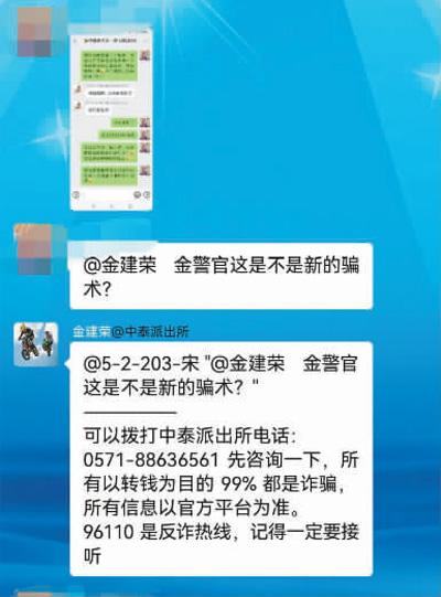 羣裏有呼,AI警官必回。前一段時間一位居民在羣裏反映自己家人可能遭遇電信詐騙,AI警官第一時間回應“請聯繫派出所值班電話88636561,我們會第一時間處理,謝謝!”並同時將警情推送給金建榮,他和同事馬上行動,最終成功阻止了這起詐騙。