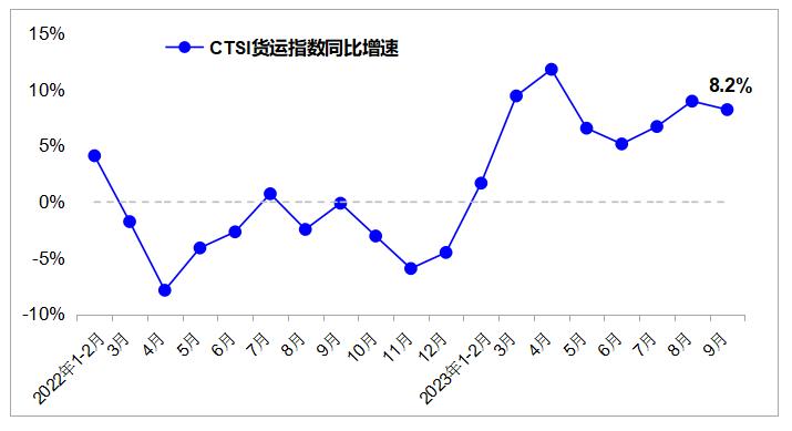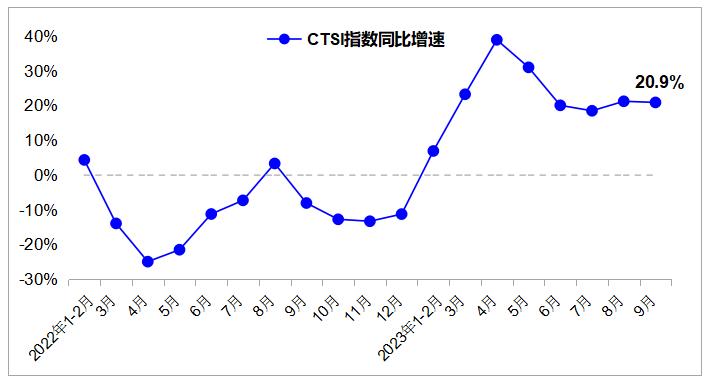 數據顯示,2023年9月,中國運輸生產指數(CTSI)爲177.5點,同比增長20.9%。分結構看,CTSI貨運指數爲209.4點,同比增長8.2%;CTSI客運指數爲114.2點,同比增長89.4%。