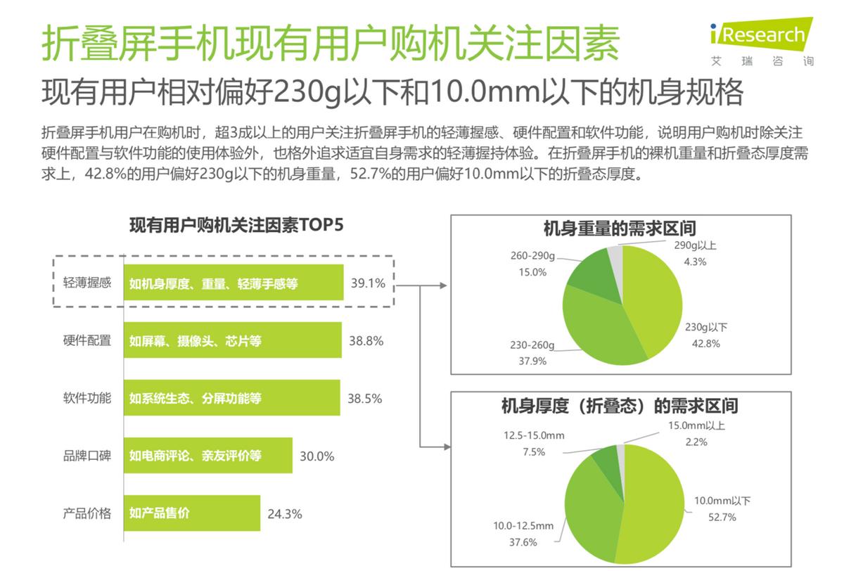 事實上,在摺疊屏替代直板機成爲主力機的進程中,“輕薄程度”成爲重要變量。艾瑞諮詢近期發佈的報告顯示,機身厚沉是當下摺疊屏市場主要用戶痛點,“輕薄握感”成爲摺疊屏手機現有用戶購機關注最大因素。Counterpoint則分析稱,輕薄不僅是影響用戶購機的關鍵因素,也是摺疊屏核心科技力的主要體現。
