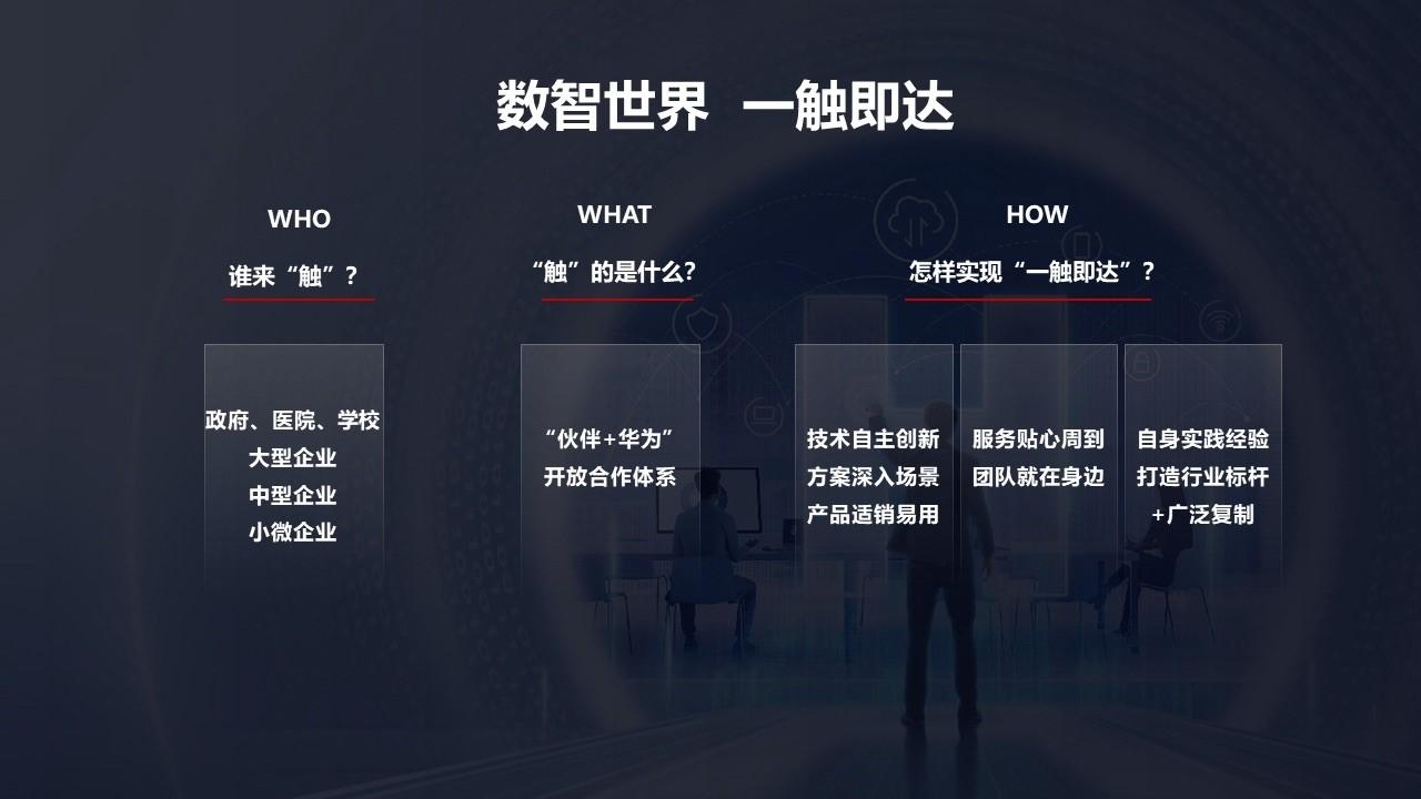 “數智世界 一觸即達”,這句口號不僅凝鍊了華爲對現階段企業數字化、智能化發展的深入理解和思考,更體現了華爲“把複雜留給自己,把簡單帶給客戶”的決心和行動——基於強大的研發實力、持續的研發投入,打造自主創新的技術、適銷易用的產品、深入場景的方案;攜手夥伴,結合省心周到的服務和就在身邊的團隊,以及自身+行業轉型的成功經驗和廣泛複製,讓千行萬業加速與數智世界,一觸即達。
