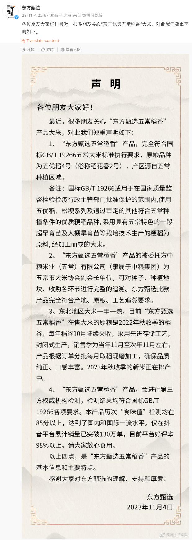 11月4日晚,東方甄選發佈聲明稱,“東方甄選五常稻香”產品,完全符合國標GB/T 19266五常大米標準執行要求,原糧品種爲五優稻4號(俗稱稻花香2號),產區源自五常種植區域。此外,此款產品完全符合產地、原糧、工藝追溯要求。